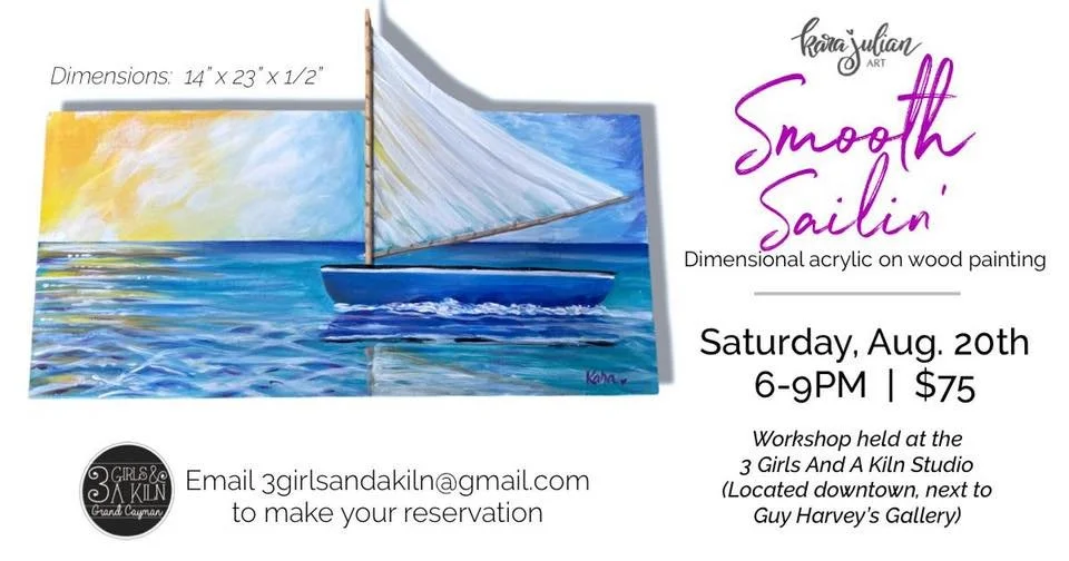 There’s nothing quite like a hot summer to inspire an ocean-themed painting. We are SO excited to have Kara Julian from Kara’s Glass Garden in-studio for this unique and fun dimensional catboat painting. It will 100% take your mind off the tropical heat, as you imagine a quiet and breezy, sunset sail.