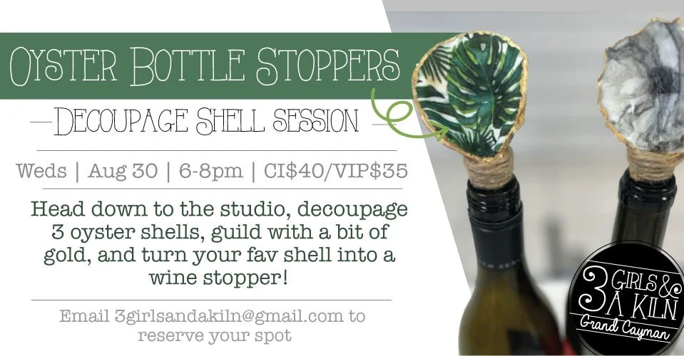 Experience the art of decoupage, the layering of fabric or paper overlaid on an oyster shell at 3 Girls and a Kiln - while, together, we all create 3 decoupaged oysters and will transform the best one of the 3 into a wine stopper. Wine? Oysters? Art? These are a few of my favorite things… all in one night! Once are oysters are good and decorated, we’ll guild with a bit of gold and boom - you have your new favorite wine stopper!