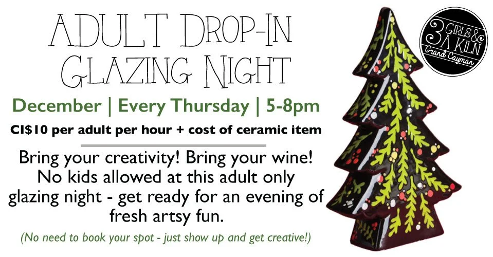 There is no need to book your space ahead of time, but email us at 3girlsandakiln@gmail.com if you would like to reserve space for a drop-in glazing session on another day. There is no appointment needed on the Thursday drop-in sessions.