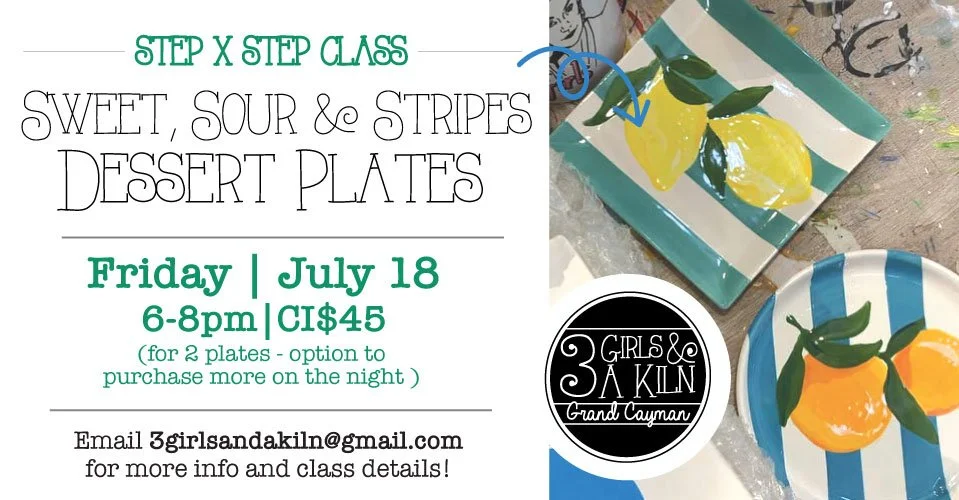 A brand new class for summer 2025 celebrating dessert plates that are a lil bit sweet, a tad bit sour and super duper stripe-y! We (Debs&Claire!) are hosting our first step by step pottery painting class where we’ll do each step with you…and end up with a gorgeous result!