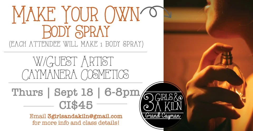We’ve got a brand new class to heat up this summer and for the first time ever, you can make your own body spray w/Caymanera Cosmetics at 3 Girls and a Kiln!