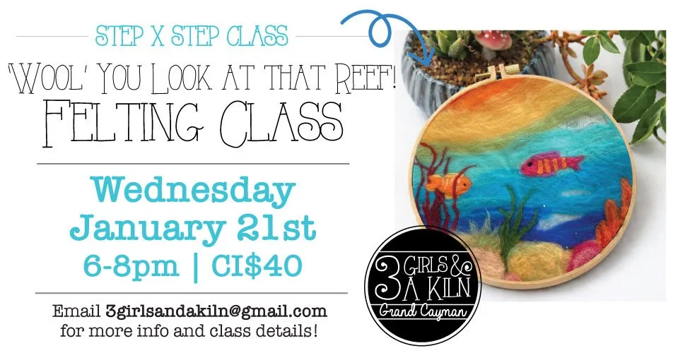 Secure your spot by contacting us at 3girlsandakiln@gmail.com. Limited spaces are available, so don't miss out on this opportunity to create your own awesome wool underwater felted scene!