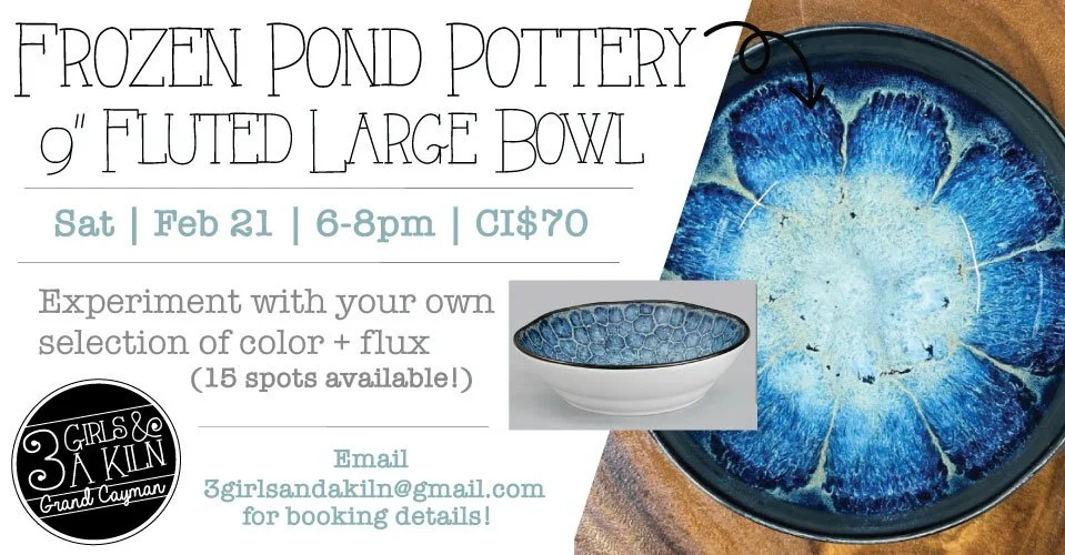 Learn this gorgeous and simple technique of stoneware glaze layering on a 9” Stoneware Bowl. We’re super-stoked to be teaching the ‘Frozen Pond technique’ - Pools of color that will sparkle and dazzle when they come out of the kiln. Only 15 spots available!