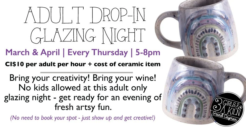 There is no need to book your space ahead of time, but email us at 3girlsandakiln@gmail.com if you would like to reserve space for a drop-in glazing session on another day. There is no appointment needed on the Thursday drop-in sessions.